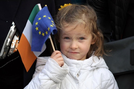 Una niña con las banderas de Irlanda y la UE,